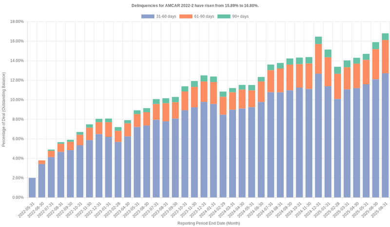 Delinquencies for AmeriCredit 2022-2 have risen from 15.89% to 16.80%.2025-09-23