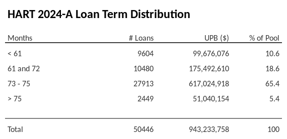 HART 2024-A has 65.4% of its pool comprised of loans with a loan term between 73 - 75 months, totaling $617,024,918 in unpaid principle balance according to Edgar sec.gov filings. The reporting period for this information begins 2025-08-01 and ends 2025-08-31.