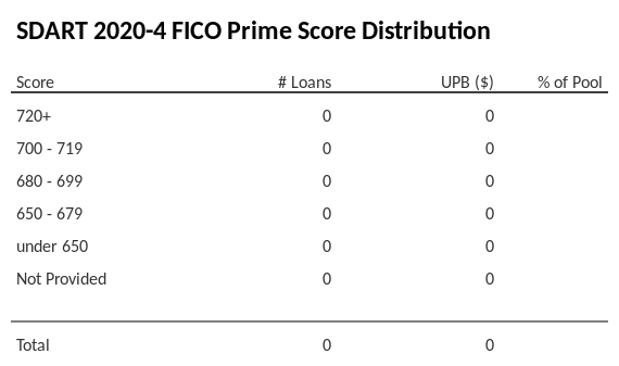 Summarize the prime fico distribution for SDART 2020-4. Highlight the distribution of loans across the prime FICO score bands (e.g., 720+, 700-719). Discuss the dominance of 720+ scores and its implications for the pool's credit quality and risk profile.