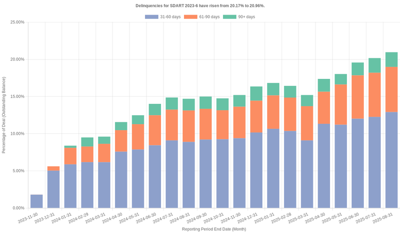 Delinquencies for Santander Drive 2023-6 have risen from 20.17% to 20.96%.2025-09-15