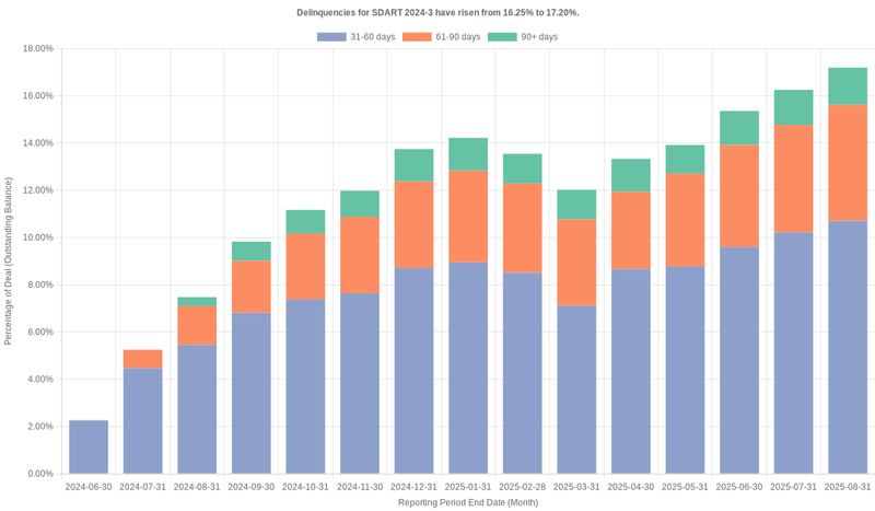 Delinquencies for Santander Drive 2024-3 have risen from 16.25% to 17.20%.2025-09-15