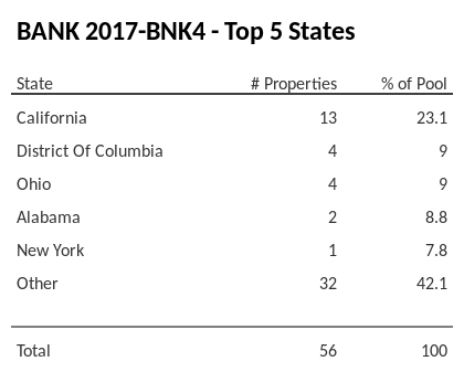 The top 5 states where collateral for BANK 2017-BNK4 reside. BANK 2017-BNK4 has 23.1% of its pool located in the state of California.