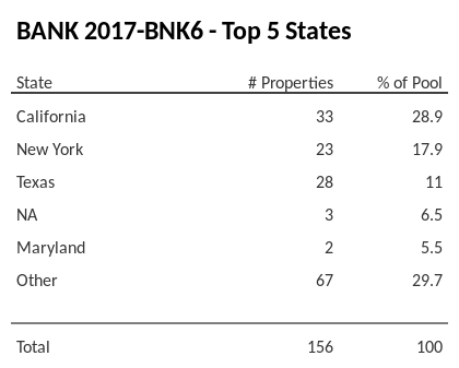 The top 5 states where collateral for BANK 2017-BNK6 reside. BANK 2017-BNK6 has 28.9% of its pool located in the state of California.