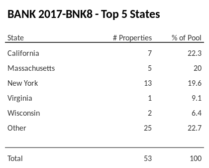 The top 5 states where collateral for BANK 2017-BNK8 reside. BANK 2017-BNK8 has 22.3% of its pool located in the state of California.
