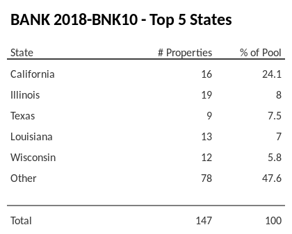 The top 5 states where collateral for BANK 2018-BNK10 reside. BANK 2018-BNK10 has 24.1% of its pool located in the state of California.