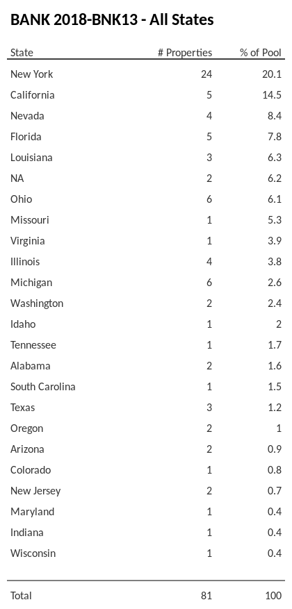 BANK 2018-BNK13 has 20.1% of its pool located in the state of New York.