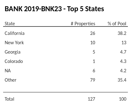 The top 5 states where collateral for BANK 2019-BNK23 reside. BANK 2019-BNK23 has 38.2% of its pool located in the state of California.