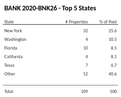 The top 5 states where collateral for BANK 2020-BNK26 reside. BANK 2020-BNK26 has 25.6% of its pool located in the state of New York.