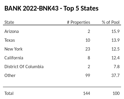 The top 5 states where collateral for BANK 2022-BNK43 reside. BANK 2022-BNK43 has 15.9% of its pool located in the state of Arizona.