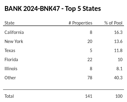 The top 5 states where collateral for BANK 2024-BNK47 reside. BANK 2024-BNK47 has 16.3% of its pool located in the state of California.