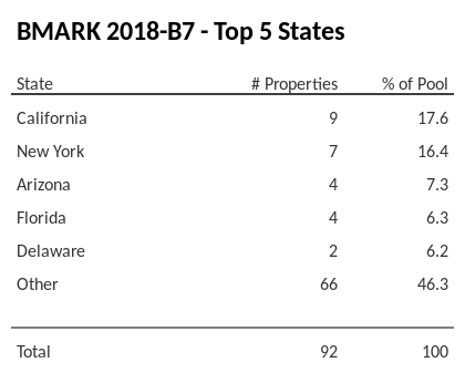 The top 5 states where collateral for BMARK 2018-B7 reside. BMARK 2018-B7 has 17.6% of its pool located in the state of California.