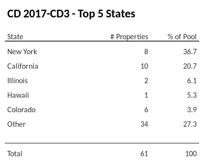 The top 5 states where collateral for CD 2017-CD3 reside. CD 2017-CD3 has 30.8% of its pool located in the state of New York.