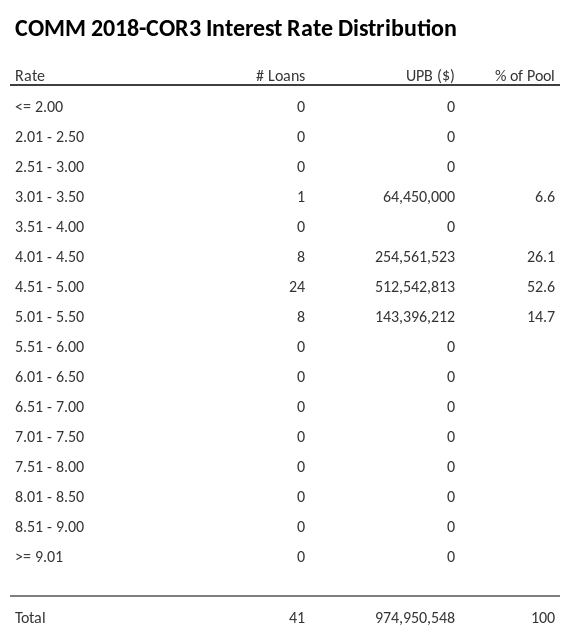 COMM 2018-COR3 has 52.6% of its pool with interest rates 4.51 - 5.00.