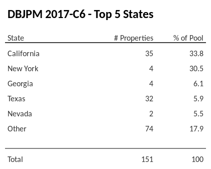 The top 5 states where collateral for DBJPM 2017-C6 reside. DBJPM 2017-C6 has 33.8% of its pool located in the state of California.