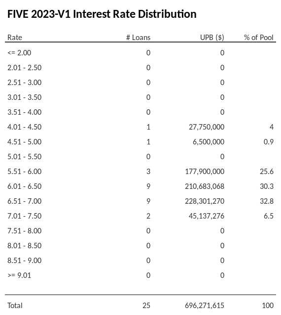 FIVE 2023-V1 has 32.8% of its pool with interest rates 6.51 - 7.00.