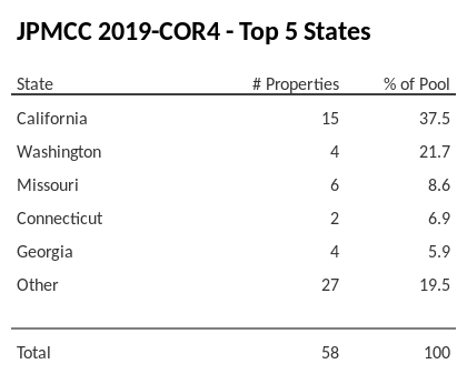 The top 5 states where collateral for JPMCC 2019-COR4 reside. JPMCC 2019-COR4 has 37.5% of its pool located in the state of California.