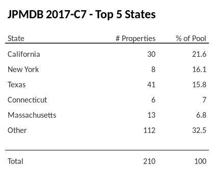 The top 5 states where collateral for JPMDB 2017-C7 reside. JPMDB 2017-C7 has 21.6% of its pool located in the state of California.