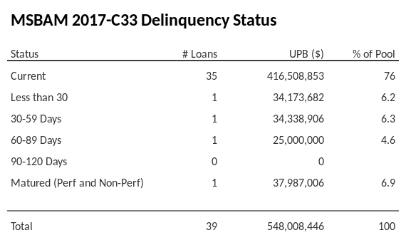 MSBAM 2017-C33 has 76% of its pool in "Current" delinquency status, totaling $416,508,853 in unpaid principle balance according to Edgar sec.gov filings. The reporting period for this information begins 2025-08-12 and ends 2025-09-11.