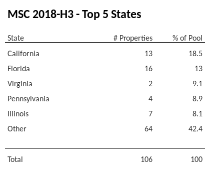 The top 5 states where collateral for MSC 2018-H3 reside. MSC 2018-H3 has 18.5% of its pool located in the state of California.