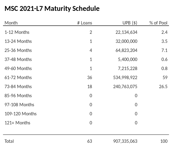 MSC 2021-L7 has 59% of its pool maturing in 61-72 Months, totaling $534,998,922 in unpaid principle balance according to Edgar sec.gov filings. The reporting period for this information begins 2025-08-12 and ends 2025-09-11.