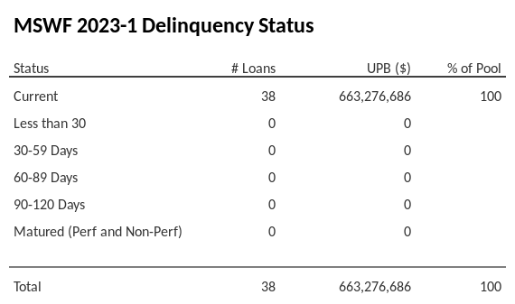 MSWF 2023-1 has 100% of its pool in "Current" delinquency status, totaling $663,276,686 in unpaid principle balance according to Edgar sec.gov filings. The reporting period for this information begins 2025-08-12 and ends 2025-09-11.