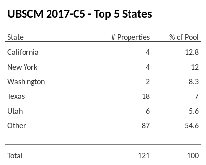 The top 5 states where collateral for UBSCM 2017-C5 reside. UBSCM 2017-C5 has 12.8% of its pool located in the state of California.