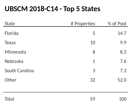The top 5 states where collateral for UBSCM 2018-C14 reside. UBSCM 2018-C14 has 14.7% of its pool located in the state of Florida.