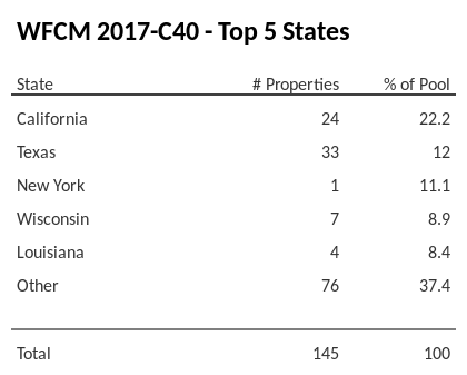 The top 5 states where collateral for WFCM 2017-C40 reside. WFCM 2017-C40 has 22.2% of its pool located in the state of California.