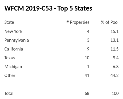 The top 5 states where collateral for WFCM 2019-C53 reside. WFCM 2019-C53 has 15.1% of its pool located in the state of New York.
