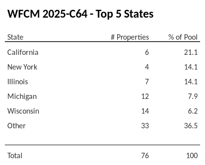 The top 5 states where collateral for WFCM 2025-C64 reside. WFCM 2025-C64 has 21.1% of its pool located in the state of California.